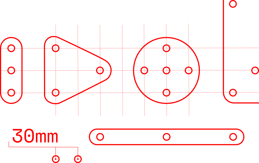 The inspiration for this is drawn from erector sets. In an erector set all parts fit together because they are based on the same grid – the distance between the holes for the nuts and bolts is always the same. Ikego uses this principle. The Ikego-Grid uses distance of 30mm: